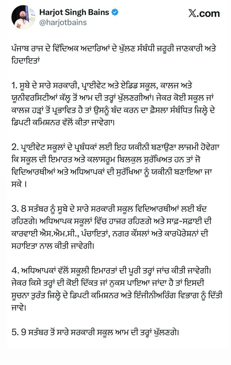 ਹੁਣ, ਕਿਉਂਕਿ ਕੁਝ ਖੇਤਰਾਂ ਵਿੱਚ ਹੜ੍ਹ ਦਾ ਪਾਣੀ ਘੱਟ ਰਿਹਾ ਹੈ, ਵਿਭਾਗ ਸੋਮਵਾਰ, 8 ਸਤੰਬਰ, 2025 ਤੋਂ ਸਕੂਲ ਦੁਬਾਰਾ ਖੋਲ੍ਹਣ ਦਾ ਇਰਾਦਾ ਰੱਖਦਾ ਹੈ। ਹਾਲਾਂਕਿ, ਵੱਖ-ਵੱਖ ਜ਼ਿਲ੍ਹਿਆਂ ਵਿੱਚ ਨੁਕਸਾਨ ਦੀ ਵੱਖ-ਵੱਖ ਹੱਦ ਨੂੰ ਦੇਖਦੇ ਹੋਏ, ਸਾਰੇ ਜਾਂ ਕੁਝ ਸਕੂਲ ਖੋਲ੍ਹਣ ਦਾ ਅੰਤਿਮ ਫੈਸਲਾ ਸਬੰਧਤ ਡਿਪਟੀ ਕਮਿਸ਼ਨਰਾਂ ‘ਤੇ ਛੱਡ ਦਿੱਤਾ ਗਿਆ ਹੈ।